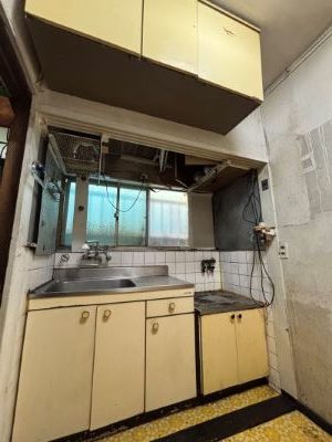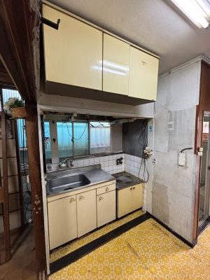 キッチンは、上部の変なスペースと棚を解体し換気扇を左からコンロ上の右へ移動しキッチンすべてを交換します。