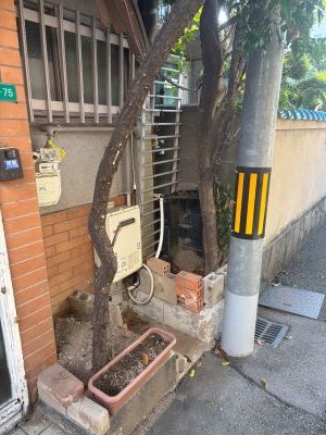 外観と玄関は、大きく成長した木を含め3本とも伐採します。道路とお隣さん敷地に枝と葉っぱがはみ出ていますのでスッキリさせるために切ります。