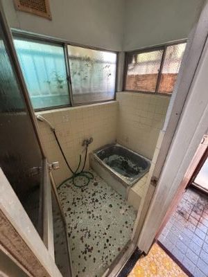 室内に洗濯置き場がない、洗面台スペースが狭く階段前にあり使いずらい、お風呂が古い在来工法のタイル、キッチンが古く換気扇の位置も逆、